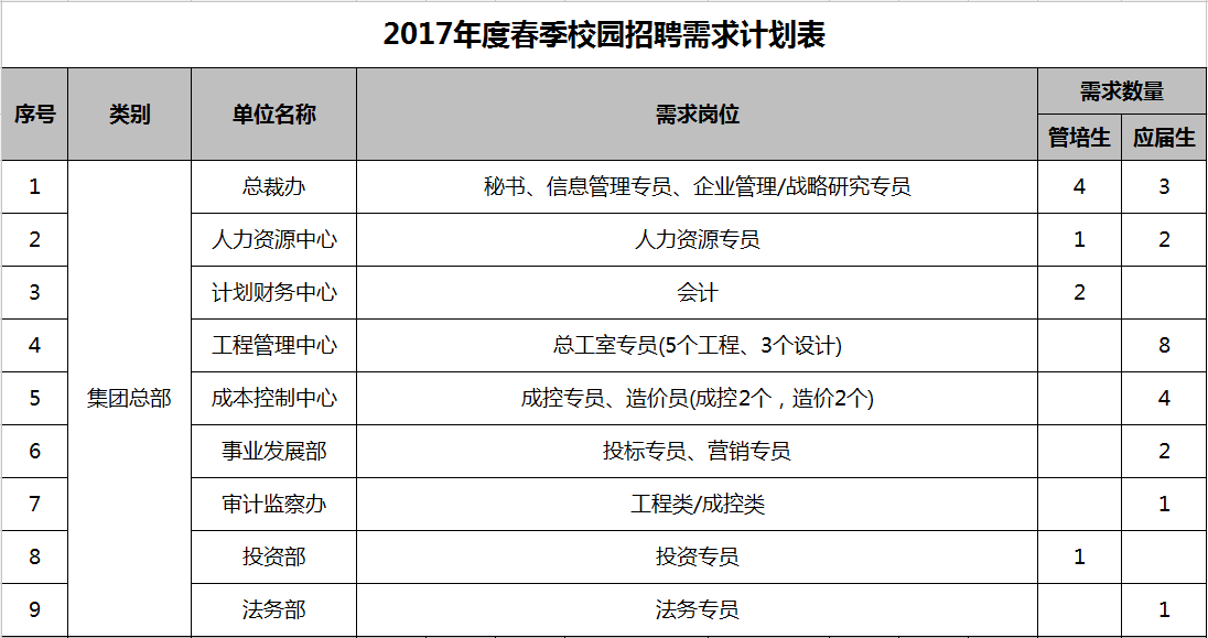 总部管理机构:总裁办公室、人力资源中心、计划财务中心、事业发展部(一部)、成本控制中心、工程管理中心、审计监察办、证券部、法务部、投资部等 。