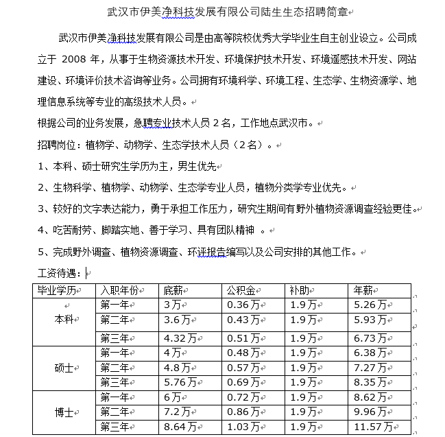 武汉市伊美净科技发展有限公司陆生生态招聘简章