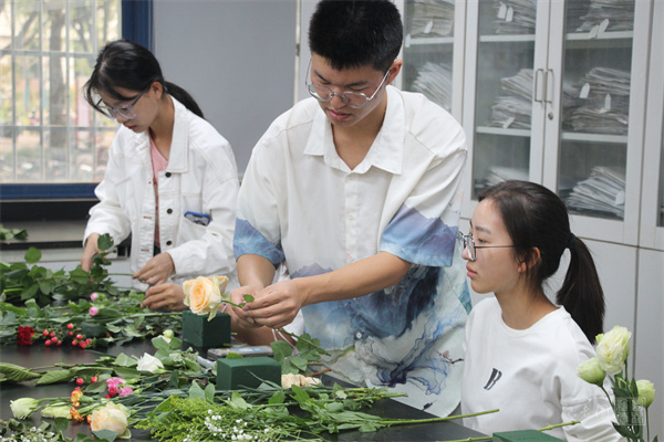 温柔浪漫的月季,纯洁灵动的雏菊,小巧清新的满天星,各色花材铺满桌面。在工作人员的协助下,大家将多种花材修剪、整枝,再根据不同的色彩与形状进行搭配。鲜花与绿叶错落有致、层次分明,一个又一个独具创意的花艺作品跃然呈现。现场气氛热烈,花香四溢,笑语不断。经济与管理学院经济2207班的何海约是第一次参加插花活动,她分享道:“一直觉得插花很有意思,这次活动让我真正体验到了插花的魅力,也提高了自己的动手能力。”外国语学院的刘峥表示:“我感觉插花是一个很有意义的事情,可以把自己的所思所想通过花材的设计表达出来。比如我这次插花的灵感就是‘玫瑰少年’,所以以两朵玫瑰为主体进行了搭配。”