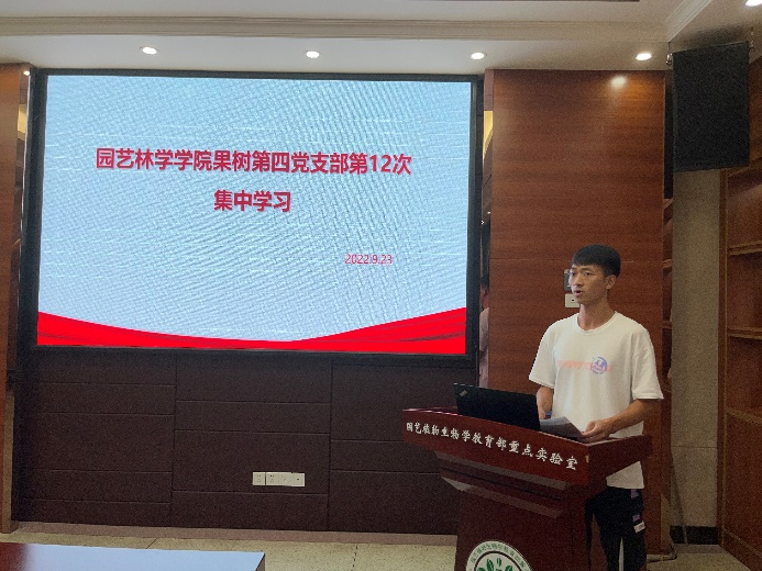9月23日,果树学研究生第四党支部在南楼206会议室开展9月主题党日活动。活动主要分为学深悟透《习近平谈治国理政》(第四卷)、学习贯彻习近平总书记给北京师范大学“优师计划”师范生重要回信精神、支部党员研讨交流三个部分。党支部书记刘旭主持会议,支部全体党员共同参与学习。